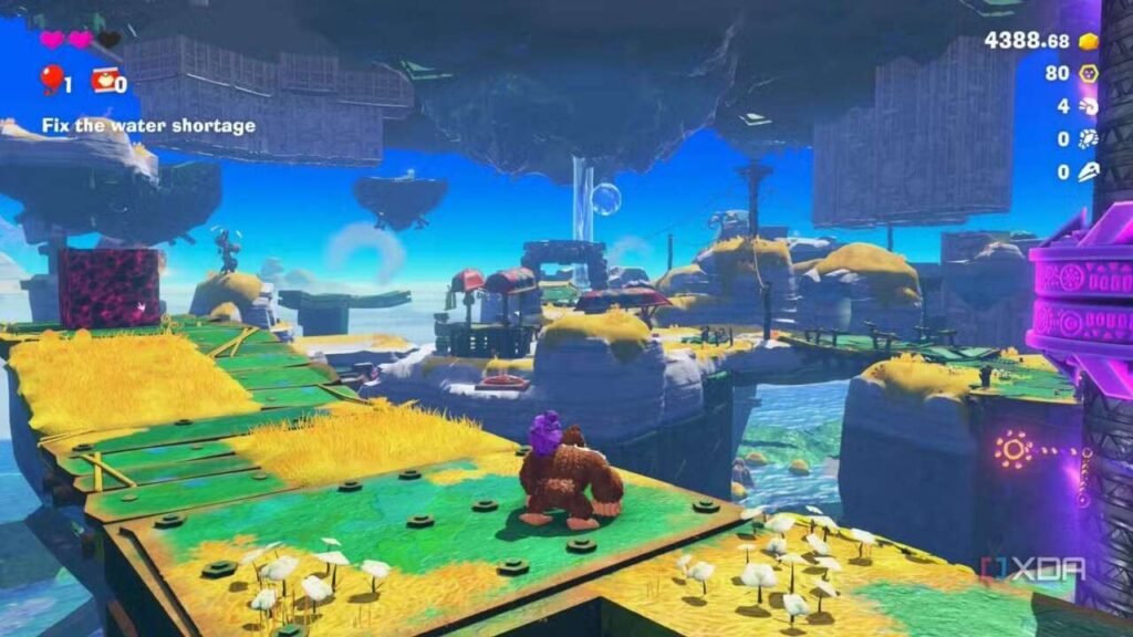 Bananza também conta com uma loja de personalização, na qual é possível personalizar o visual dos personagens. Apesar das cores clássicas de DK serem familiares, me diverti jogando com pelagem preta ou azul-brilhante. Além das cores, há acessórios (como suspensórios e gravatas) que melhoram atributos específicos. Pessoalmente, nunca senti falta desses bônus, mas são uma adição divertida para quem gosta de personalizar o personagem.