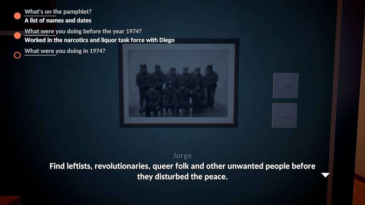 Mas não se trata de uma jornada solitária. Melinda, uma jornalista militante, nos auxilia para resolver esse caso interrogando as pessoas e coletando informações para debater com Jorge. É uma dinâmica muito interessante e bem explorada através das mecânicas e pelo decorrer da história.