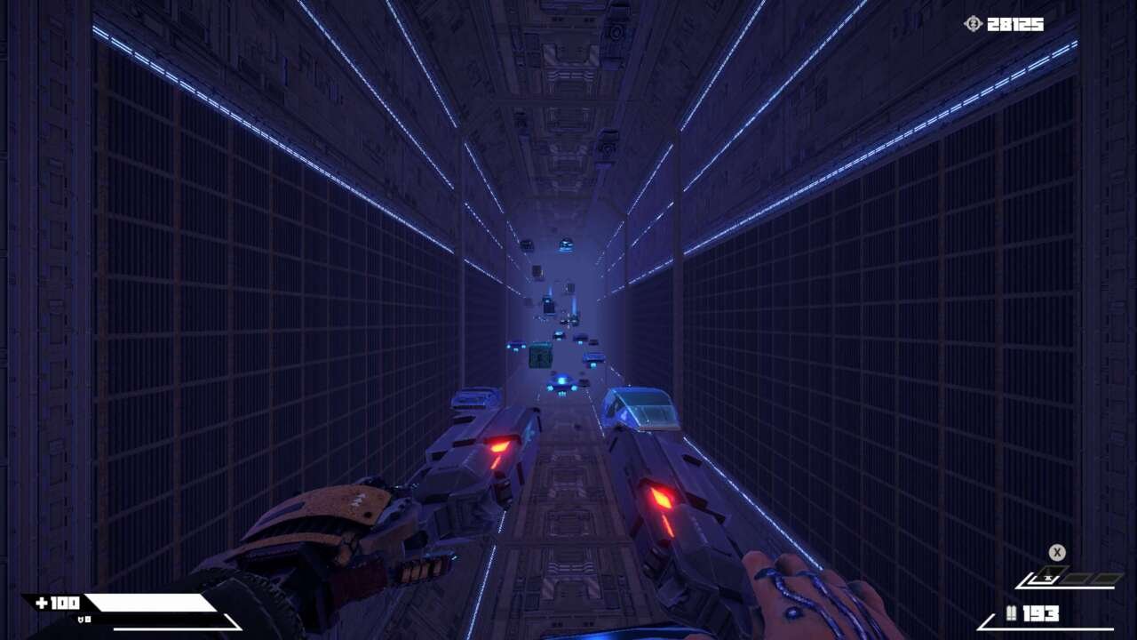 A temática cyberpunk tem estado sob os holofotes da indústria de games recentemente, graças a títulos fantásticos como Cyberpunk 2077. Turbo Overkill é mais uma dessas obras que sabe aproveitar essa temática tão rica e estilosa. Com cenários repletos de luzes neon e seres humanos tão modificados que não sabemos se ainda são humanos ou máquinas, o jogo consegue explorar a temática até mesmo no level design de algumas das fases, com desafios de plataforma em que devemos pular entre carros voadores e até mesmo pilotar um enquanto exploramos.